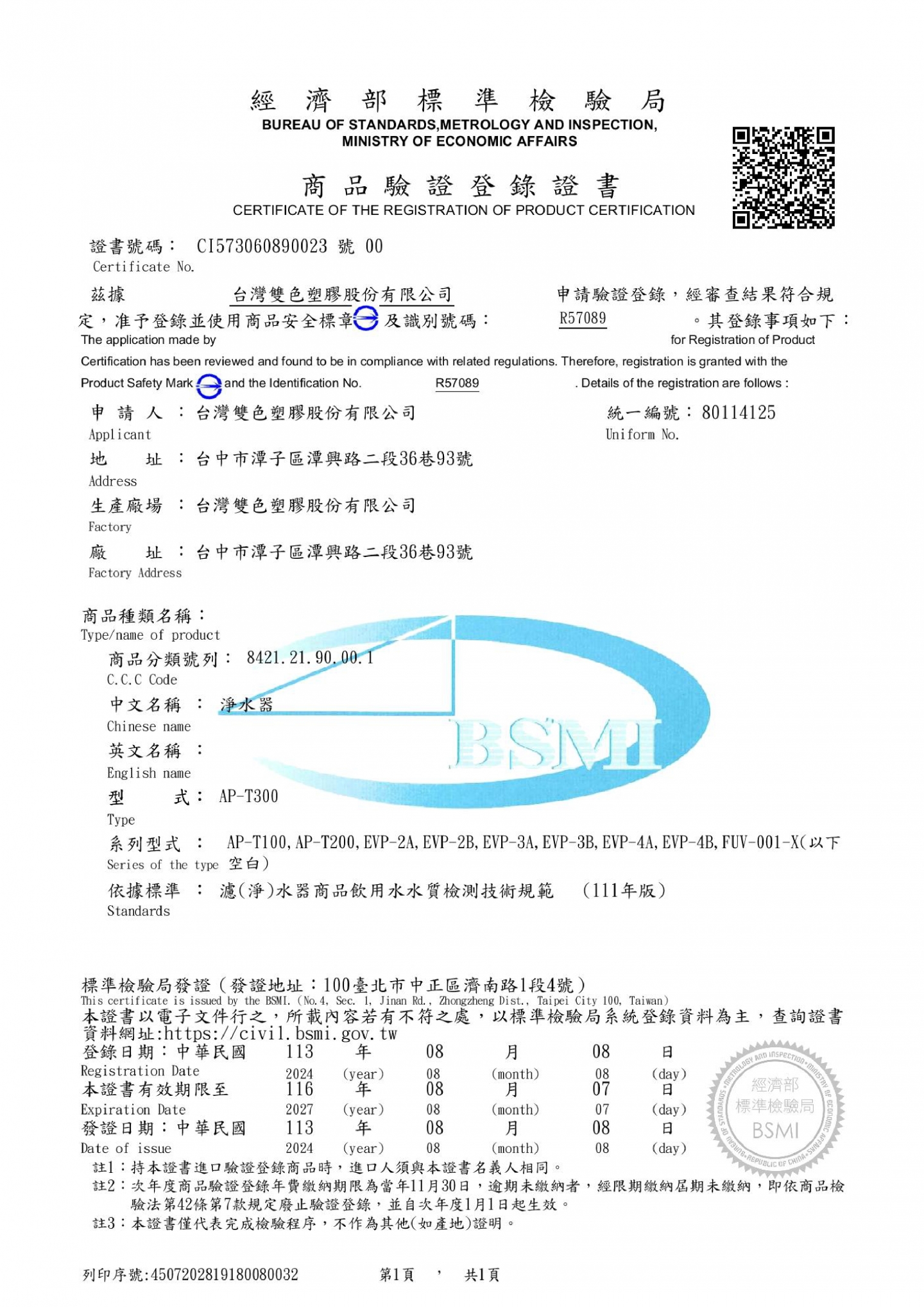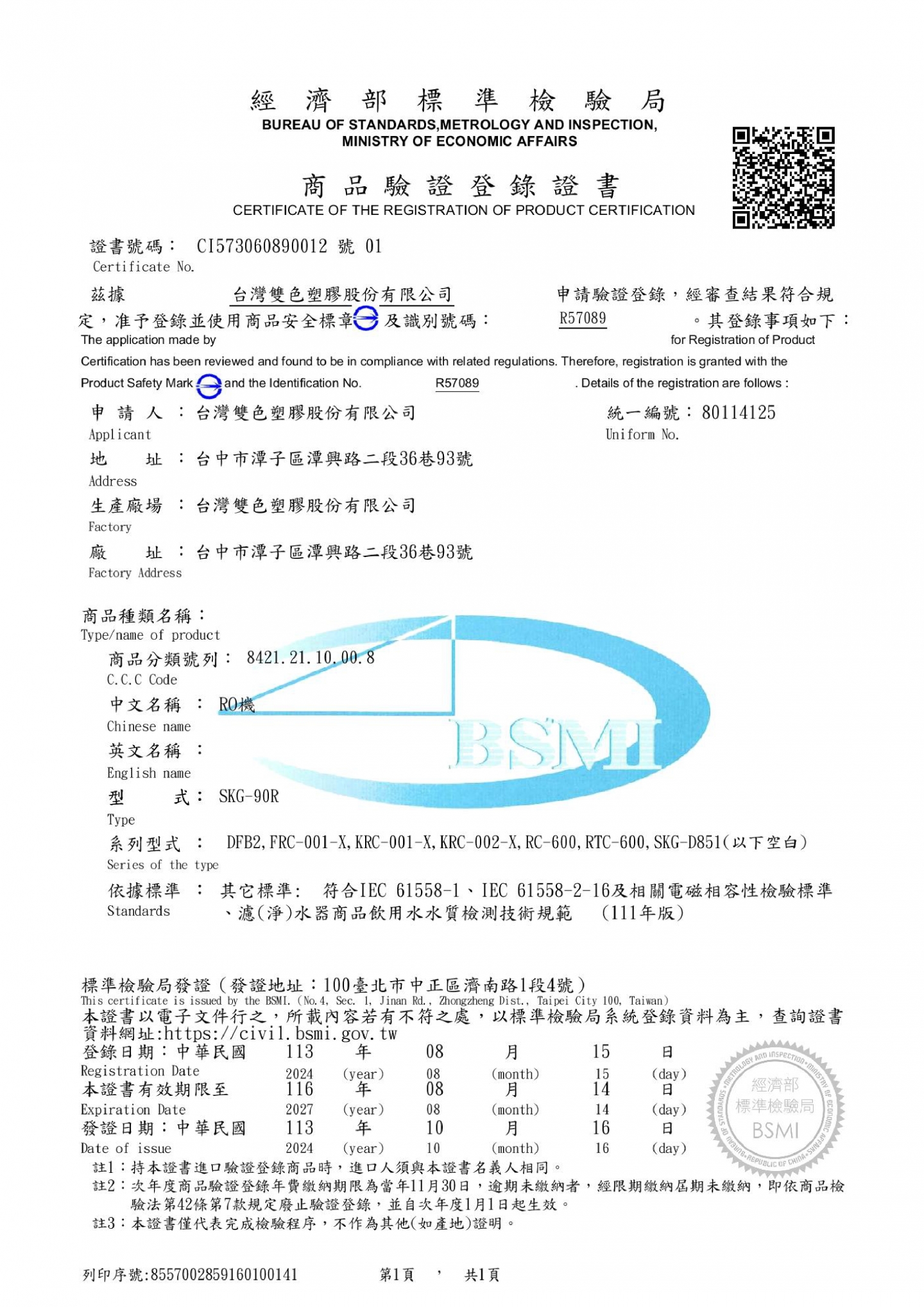 台灣雙色塑膠股份有限公司已取得經濟部標準檢驗局R57089編號,RO機與淨水器皆獲得BSMI認證